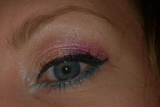 Under ögat är en eyeliner draget med ögonskuggor blandade med vatten. Längst in mot ögat en turkosgrön från Make up Store. En eyedust som heter Victory. Längre ut en turkosblå som kommer ifrån HM och har lite glitter i sig.